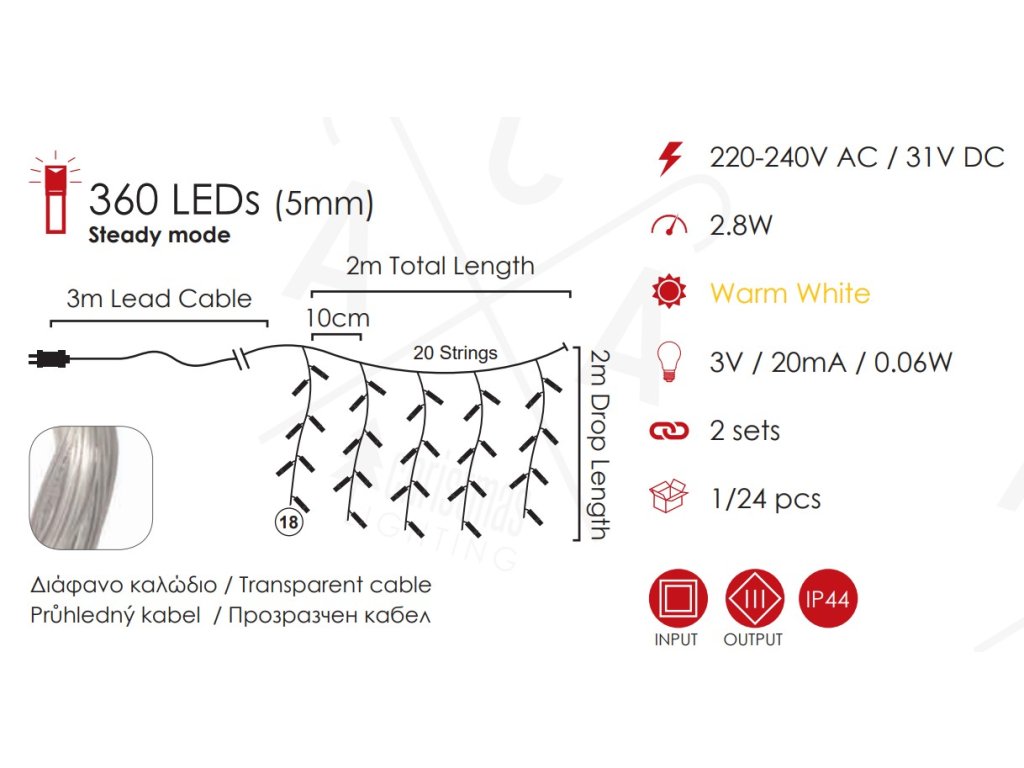 LED-Lichtvorhang, 2m, 360 LED, 20x Abzweig, WW, mit Adapter [X08360121]