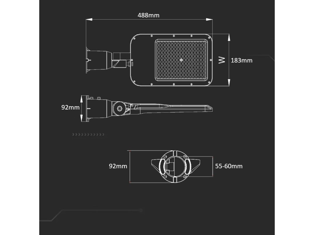 - Die Montagebohrung der Leuchte ist für Arme mit einem Durchmesser von 55–60 mm geeignet.