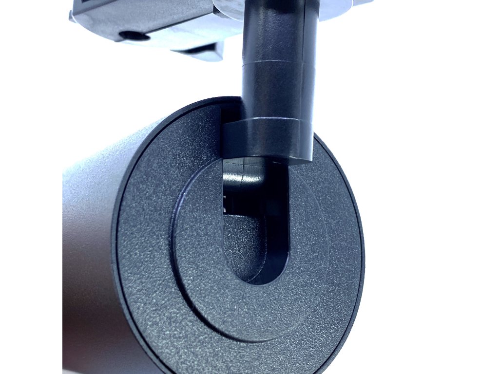 Moderne Leuchte mit verstellbarem Beleuchtungswinkel, montiert an einer Drehstromschiene. Stromschienenleuchten erfreuen sich zunehmender Beliebtheit und werden erfolgreich als Haupt- oder Spotlichtquelle in Häusern oder Wohnungen installiert und verleihen dem Interieur eine einzigartige Note.
